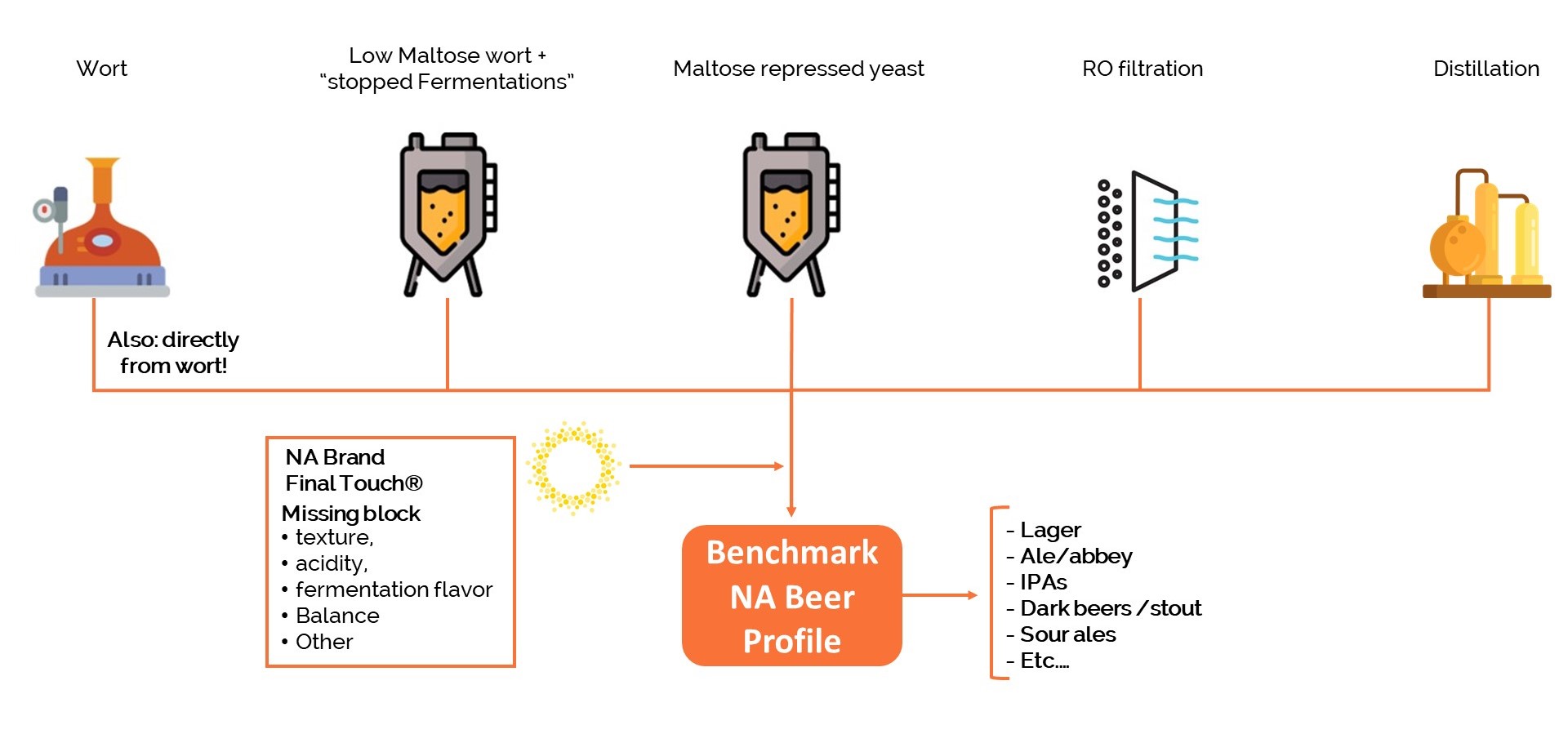 There are different techniques to produce NABLABs: special brewing diagram to minimize fermentable sugars, use of special yeasts that do not ferment maltose, short cold contact with yeast, alcohol elimination by inverse of osmosis or vacuum distillation and different combinations of these techniques.